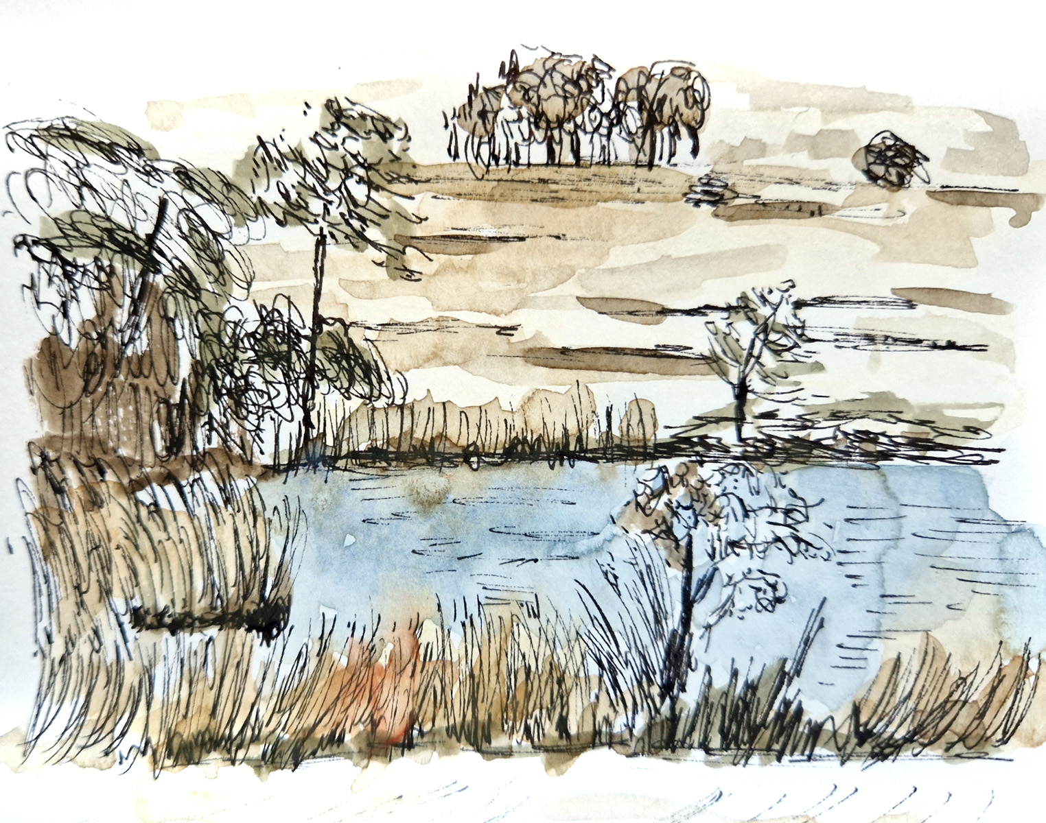 Mitzubringendes Material bei „Bäume“ und „Wümme“: Skizzenbuch, Zeichenblock, Bleistifte in unterschiedlichen Härtegraden, Fineliner, Aquarell und Pinsel.