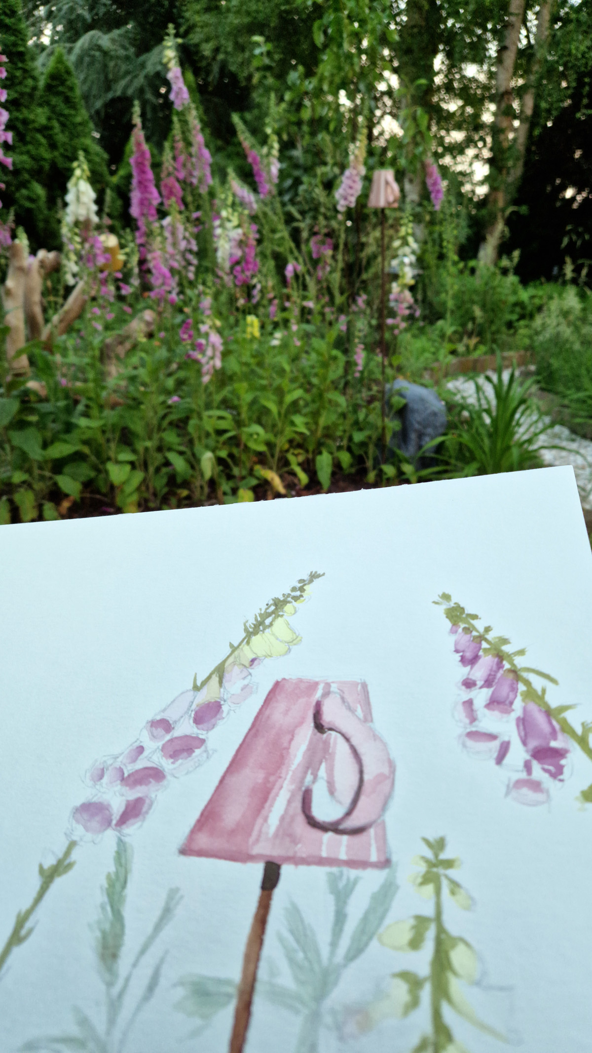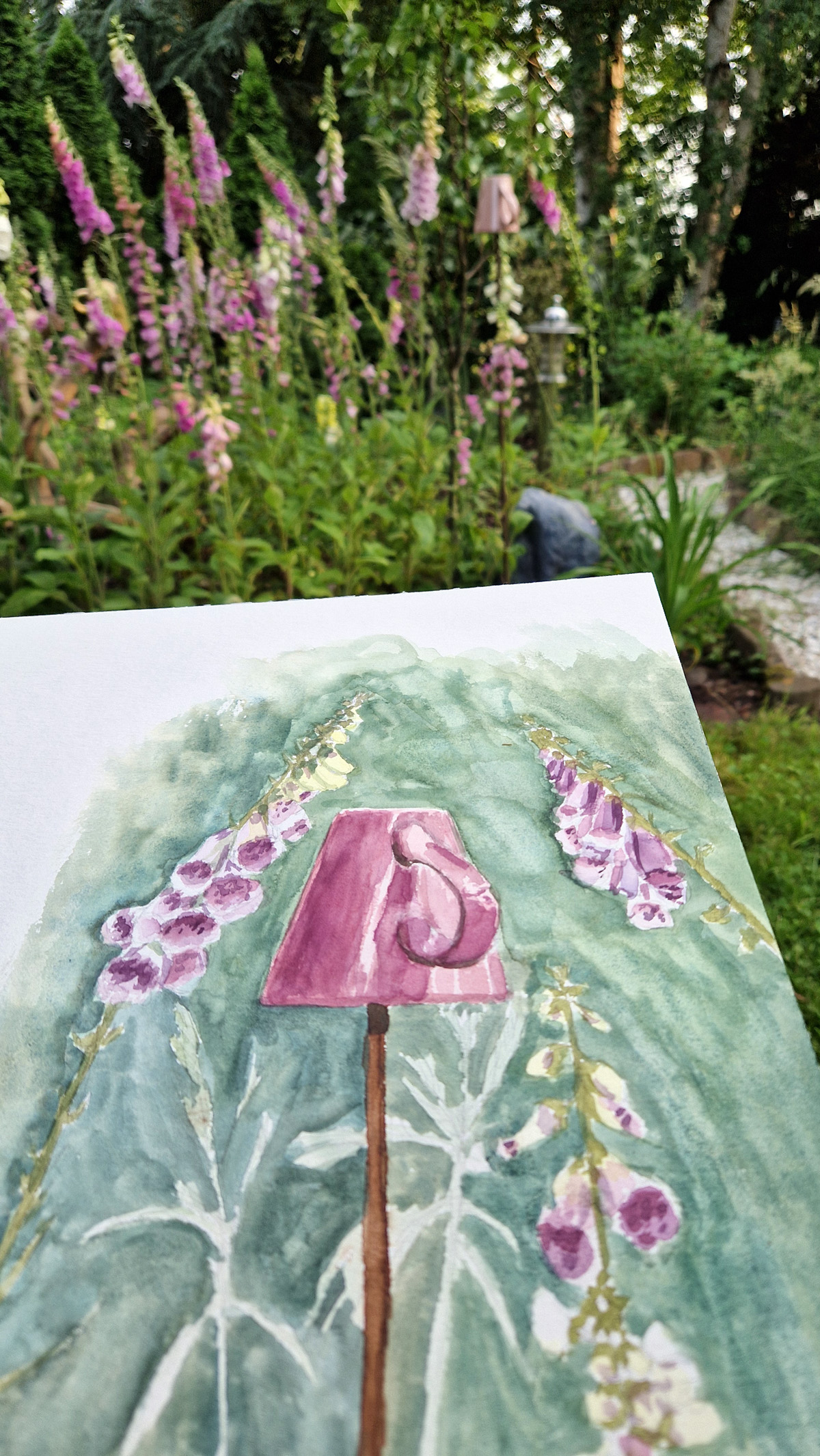 Hier habe ich einen Becher als Verlegenheitsgartendeko verwendet, und ich fand es doch sehr schön, dass sich all die Fingerhüte um ihn geschart haben.